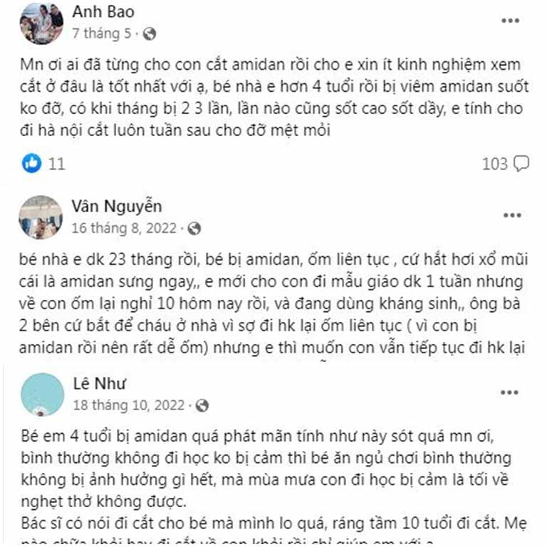 Chúng tôi có tham gia vào các hội nhóm facebook dành cho người bị viêm họng, viêm amidan và nhận thấy tỷ lệ các bậc phụ huynh đặt câu hỏi liên quan đến vấn đề trẻ bị viêm amidan là rất cao.